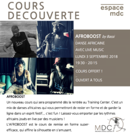 Un nouveau cours qui sera programmé dès la rentrée au Training Center. C’est un mix de danses africaines qui vous permettront de rester en forme et de garder la ligne dans un esprit festif… c’est fun ! Laissez-vous emporter par les rythmes africains joués en live par des musiciens ! L’AFROBOOST est le cours de remise en forme super-efficace, qui affine la silhouette en s’amusant.